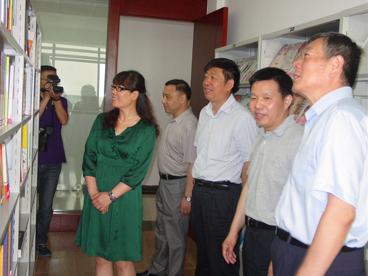 右圖為楊紀(jì)朝副會長(右一)一行在市委、市經(jīng)信委和公司領(lǐng)導(dǎo)的陪同下在公司圖書室參觀的場景。
