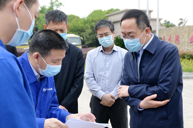 沈方勇董事長向國家衛(wèi)健委副主任于學(xué)軍(右1),國家衛(wèi)健委衛(wèi)生應(yīng)急辦公室監(jiān)察專員張國新(右2)等領(lǐng)導(dǎo)匯報天門紡機復(fù)工復(fù)產(chǎn)疫情防控情況