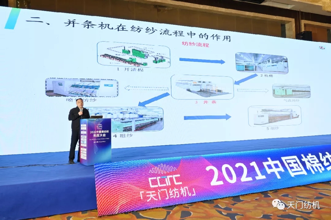 湖北天門紡織機(jī)械股份有限公司總經(jīng)理焦倫進(jìn)作了《并條機(jī)的創(chuàng)新與未來(lái)》的專題報(bào)告。在報(bào)告中,焦倫進(jìn)總經(jīng)理介紹了并條機(jī)在紡紗流程中的作用,并就目前紡織企業(yè)對(duì)并條機(jī)創(chuàng)新的要求,從傳動(dòng)結(jié)構(gòu)及精度、加壓系統(tǒng)、牽伸裝置、清潔系統(tǒng)、部件及提供設(shè)備的數(shù)字化、信息化、智能化水平等方面進(jìn)行介紹。最后,焦倫進(jìn)總經(jīng)理指出未來(lái)并條機(jī)將向著梳并聯(lián)合、并粗聯(lián)、短流程一體機(jī)在技術(shù)上的突破方向發(fā)展。