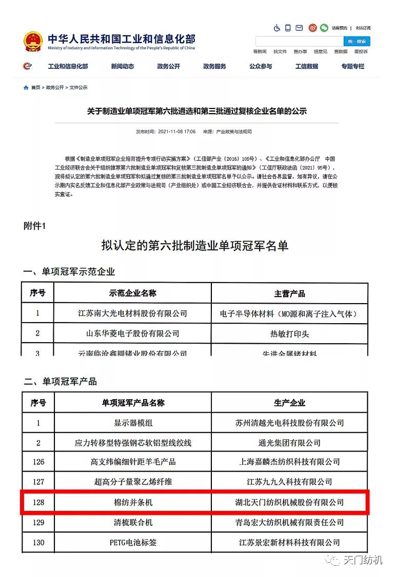 近日,國(guó)家工信部和中國(guó)工業(yè)經(jīng)濟(jì)聯(lián)合會(huì)發(fā)布通知(工信廳聯(lián)政法函〔2021〕95號(hào)),擬認(rèn)定天門(mén)紡機(jī)并條機(jī)為“單項(xiàng)冠軍產(chǎn)品”。至此,天門(mén)紡機(jī)所產(chǎn)的系列并條機(jī)成為了國(guó)內(nèi)唯一獲此殊榮的棉紡并條機(jī)。