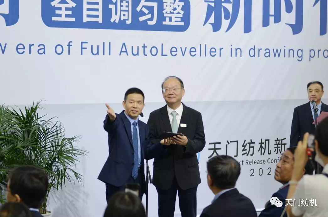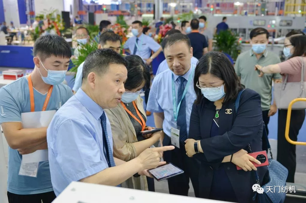 2021年6月12日,在上海國(guó)際紡機(jī)展上天門(mén)紡機(jī)舉行“開(kāi)創(chuàng)并條工序全自調(diào)勻整新時(shí)代”新品發(fā)布會(huì),中紡聯(lián)黨委書(shū)記高勇使用手持終端為新產(chǎn)品開(kāi)機(jī)