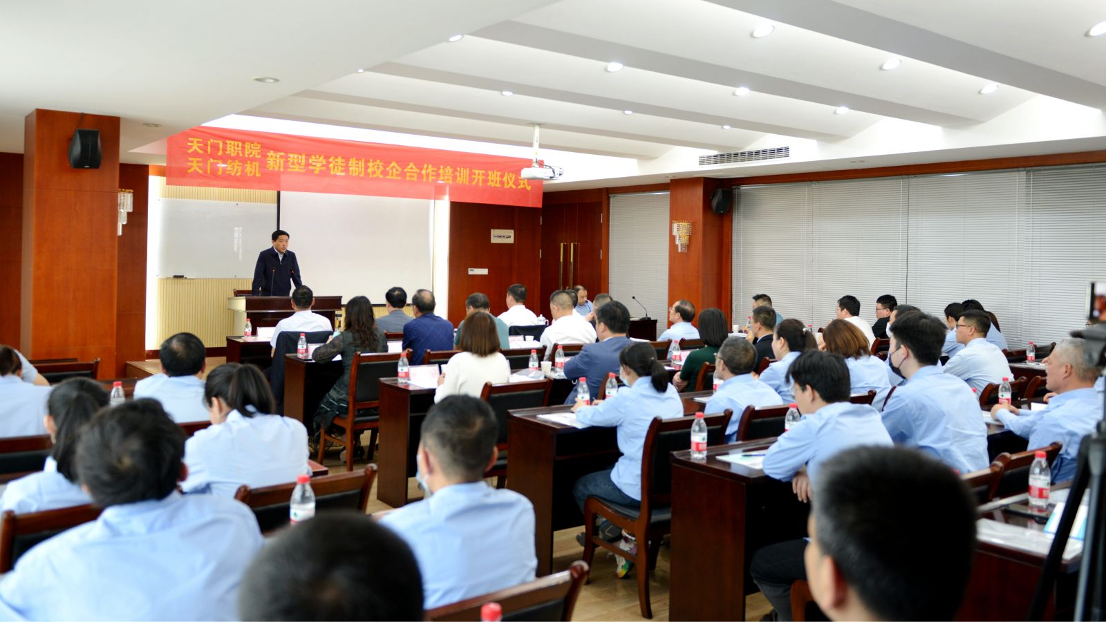 2022年4月9日,春光明媚,弱柳扶風(fēng)。天門紡機(jī)與天門職院新型學(xué)徒制技能人才培訓(xùn)開班儀式在天門紡機(jī)科技大樓隆重舉行,市委常委常務(wù)副市長涂季、市人力資源和社會保障局局長楊圣平、市企業(yè)聯(lián)合會執(zhí)行會長魏明波、市經(jīng)濟(jì)和信息化局副局長吳郁民、天門職業(yè)學(xué)院校長熊安鋒、全國人大代表天門紡機(jī)董事長沈方勇出席了開班儀式,天佳日用、徐工環(huán)保、昌達(dá)塑業(yè)、武住電裝、今御龍醫(yī)療、安潤紡織等6家企業(yè)代表及市有關(guān)媒體應(yīng)邀參加了會議。天門紡機(jī)總經(jīng)理焦倫進(jìn)主持會議。