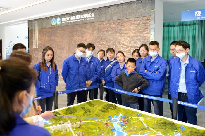 公司全體青年員工坐乘大巴車來到了張家湖國家濕地公園,它位于湖北省天門市九真鎮(zhèn),湖泊水域面積6.53平方公里,平均水深1.8米,是典型的淺水湖泊,其濕地類型屬內(nèi)陸淡水湖泊,是天門市最大的湖泊,也是湖北省保持原始生態(tài)最好的湖泊之一。到上世紀二十年代,隨著湖區(qū)淤積、湖泊萎縮,西部形成張家湖,東部形成石家湖。到達目的地后,公園的工作人員進行了熱情地接待,大家仿佛穿越到了原生態(tài)的農(nóng)耕時代,湖泊密布,半島羅列,河湖相通,一派水鄉(xiāng)澤國、湖光田園景象。來到觀鳥臺,登高望遠,一覽張家湖美景和各種野生鳥類。公園設(shè)有科普館,里面陳列了濕地的人文風貌及天門的特色文化,還有各種攝影大片。