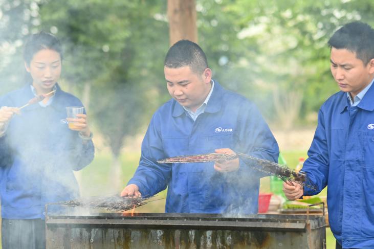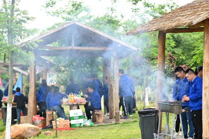帶著依依不舍的心情,青年員工們告別張家湖國家濕地公園,來到皂市長壽村原村。這是一座位于皂市鎮(zhèn)境內(nèi)的農(nóng)家樂,田園氣息濃烈,采摘和燒烤樂趣無窮,大家直奔燒烤專區(qū)。幾名青年員工已提前將炊具、餐具和食材運送到目的地,大家不顧疲憊,開始分配工作,我是“支賓先生”,你是“炊事員”,她是“勤雜員”。一會兒后,炊煙升起,香氣四溢,有燒烤和火鍋的香辣味,有菠蘿的香甜味,有主食的香糯味,更有青年朋友們團結(jié)協(xié)作的歡聲笑語。